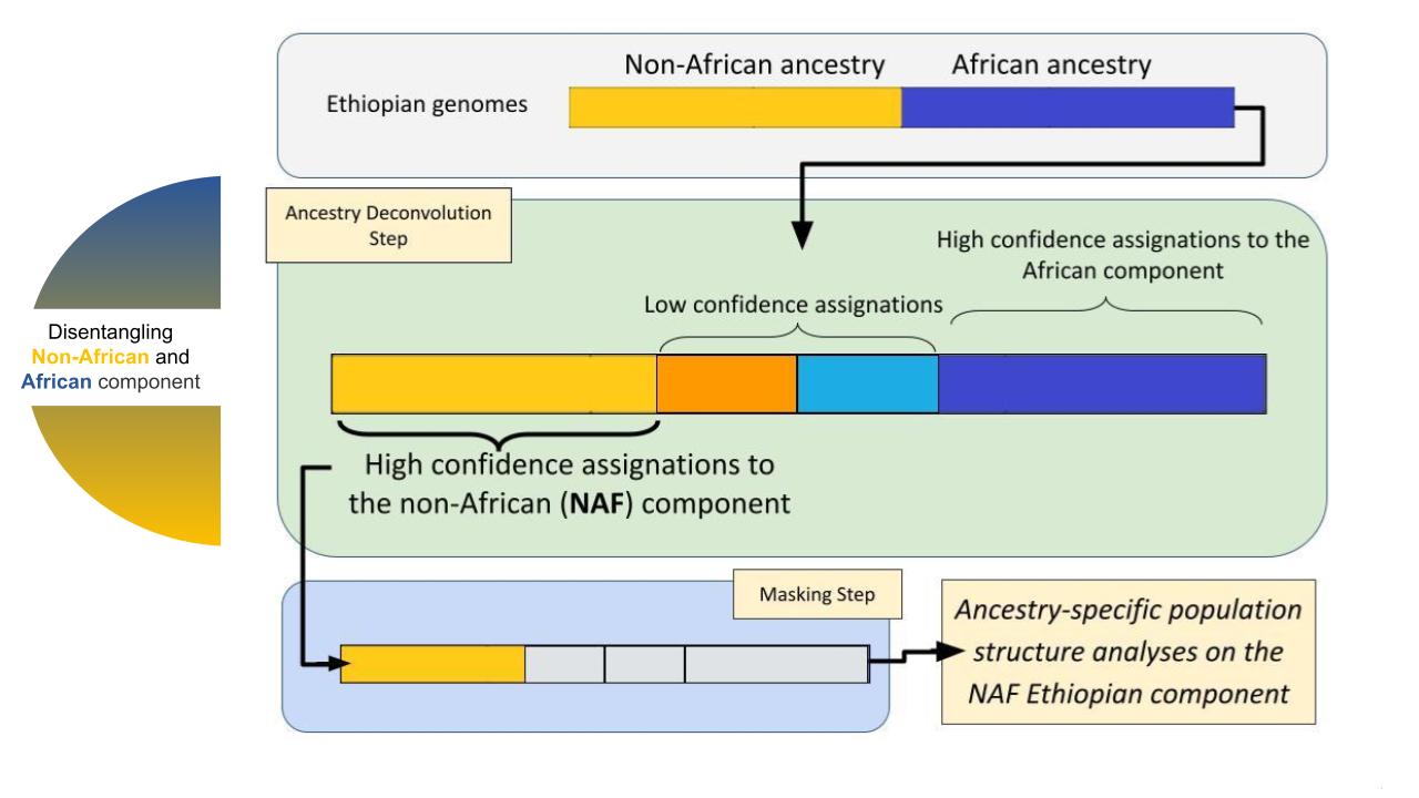 To overcome these potential biases we here propose to re-assess pattern of allele sharing between the Eurasian component of Ethiopians (here called “NAF” for Non-African) and ancient and modern proxies from the Levant and the broader Mediterranean area after having extracted NAF from Ethiopians through ancestry deconvolution. As shown elsewhere (Yelmen et al. 2019) we could therefore i) exploit high quality modern data and ii) concentrate the power of allele sharing tools on genetic fractions with no or reduced African contributions.