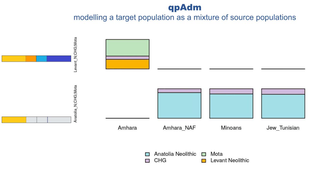We followed the observed affinity between NAF and Anatolian Neolithic-like populations through a set of f4 tests aimed at refining through more and more stringent comparisons the best proxy population for the Eurasian layer. The whole-genomes, with both African and Non-African components, are significantly closer to a Levantine ancestry rather than Anatolic (Z-Score 2.98), with them being closer to Levant Chalcolithic individuals than Levant Neolithic. On the other hand, the NAF component is shown to be closer to a Neolithic ancestry from Anatolia rather than any Levantine one (Z-score -2.847). We further compare the best proxies for the Non African component using the top scoring populations from Outgroup f3 analyses. Minoans appear to be as close to NAF as Anatolian Neolithic individuals (Z-Scores < 1). Given that our ability to pinpoint the actual source of the NAF component is inherently limited by the availability of ancient and modern populations, we used qpGraph and qpAdm to model NAF as a mixture of the major axes of genetic diversity that best describes the Mediterranean area at the time of the studied event, following Lazaridis et al. 2016. When looking at the untouched genomes, our qpAdm results replicate a Levant_N origin for the Eurasian component of Ethiopians (as in Lazaridis et al 2016). When looking at NAF, such an inference shifts towards a predominant Anatolian_N and CHG composition (~0.85 and ~0.15, respectively), remarkably similar to the modelling of Minoans and Tunisian Jews.